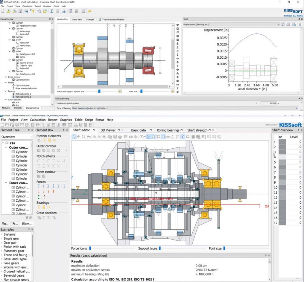 2) Вали та підшипники. Розрахунок валів та підшипників повністю інтегрований в KISSsoft. Розраховується, зокрема, міцність валів (на згин та кручення), проводиться розрахунок та підбір підшипників з врахуванням їх статичної та динамічної вантажопідйомності: кулькових та роликових (циліндричних, конічних, сферичних, голчастих), розрахунок ресурсу проводиться з врахуванням комбінованого навантаження.